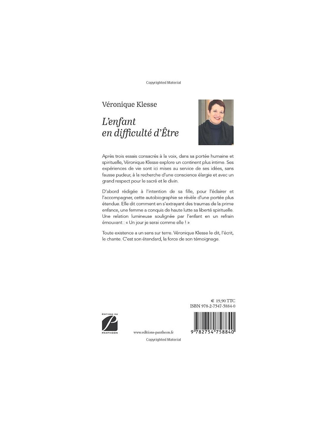 Enseignante de chant, Véronique Klesse voue une passion jamais démentie à son art et à sa transmission. Elle a consacré ses trois précédents essais à la voix (« La voix du coeur », « La voie transcendantale de la voix de l'Ange » et « La voie de l'incarnation divinisée »), et a témoigné également de son parcours de femme, de mère et de son cheminement spirituel dans « L'enfant en difficulté d'Être », « La Sagesse humaine de l'Enfant intérieur » et « De l'Enfant intérieur ».